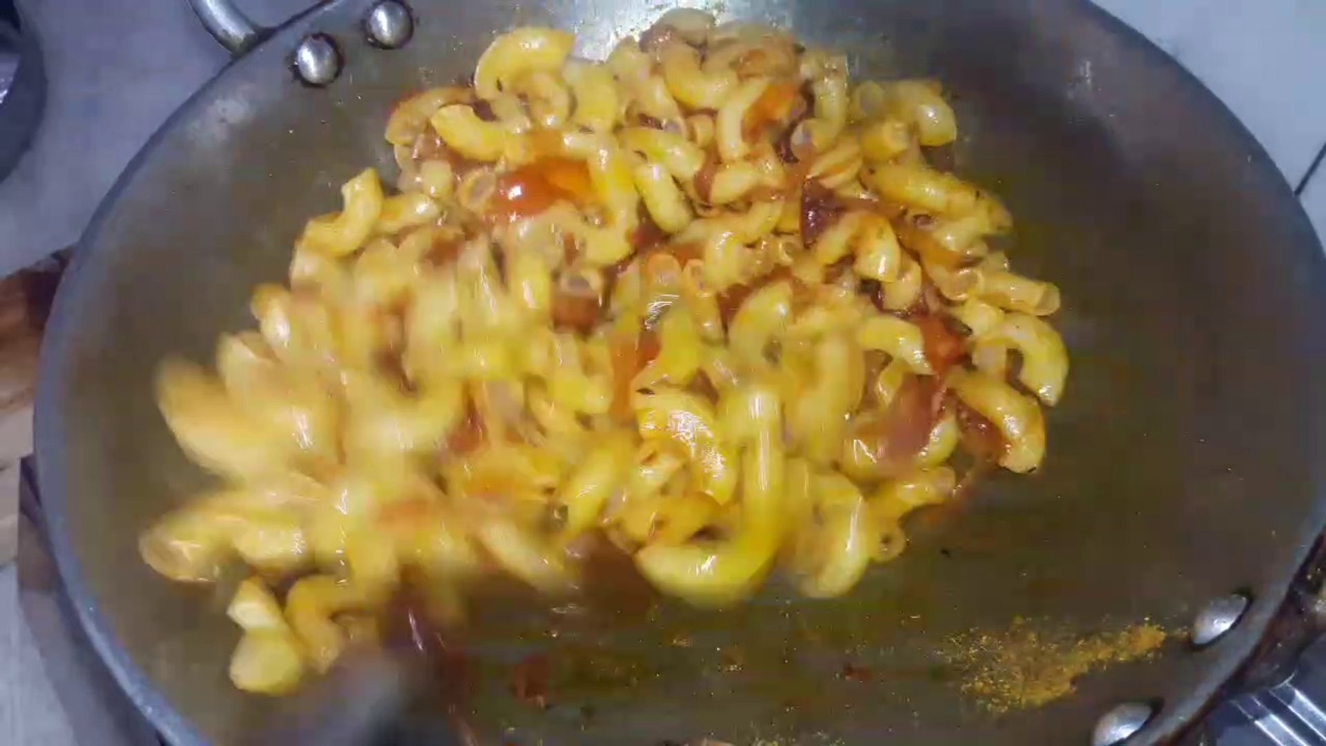 Ingredients:1 & 1/2 cup (160 gram) macaroni1 onion3 tomatoes10 pieces of garlic1 inch ginger1/2 tablespoon kashmiri lal mirch1/4 tablespoon chaat masala1/4 t.